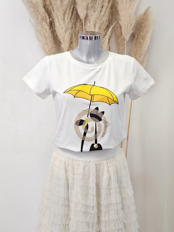 Ova bijela majica s ilustracijom donosi kreativnost i karakter u vašu svakodnevnu garderobu. Mekana i udobna, idealna je za ležerne kombinacije, a jedinstveni print dodaje poseban stil koji će sigurno privući pažnju. Nosite je uz traperice, suknje ili ispod jakne za moderni, opušteni look.